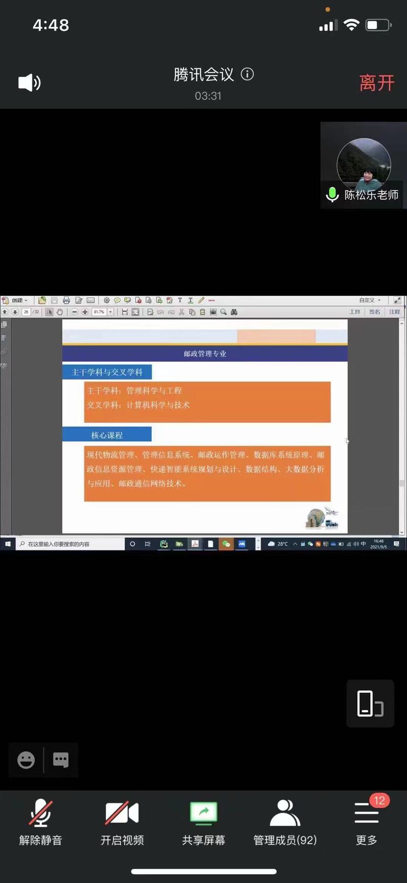 通信与信息工程学院的季薇老师、现代邮政学院的陈松乐老师、管理学院的魏静老师给大家详细介绍各专业人才培养目标、方案,课程体系设置,老师们从专业内容引申出同学们未来面临的专业发展前景和职业生涯规划,从多维度给新生们带来了一场全面丰富的专业启蒙课程。各新生班主任老师一同听取专业介绍,并在会议的最后,与同学们进行了简短而亲切的线上见面,全体师生共同期待来日校园里,携手奋进,共铸前程。