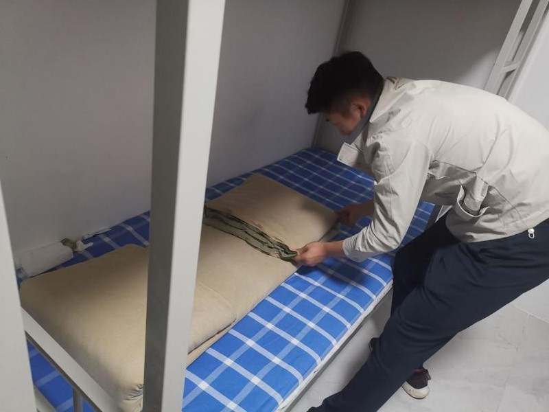 10月21日下午,32名退役老员工分别走进各寝室,为同学们展示了什么是军人内务标准。他们全程亲自示范,边操作边讲解。对折尺寸、折叠手法、掏平压实、叠出棱角……从如何将被子折成完美的“豆腐块”,到各种生活用品的摆放和收纳。大家目睹凌乱的宿舍就这样被“教官”同学妙手理新,惊讶之余内心充满钦佩。在退役老员工们的耐心指导下,大家积极配合,宿舍变得干净整齐,井然有序。大家还一起学习了环境卫生、宿舍保洁的标准,寝室内务整理工作取得显著效果。