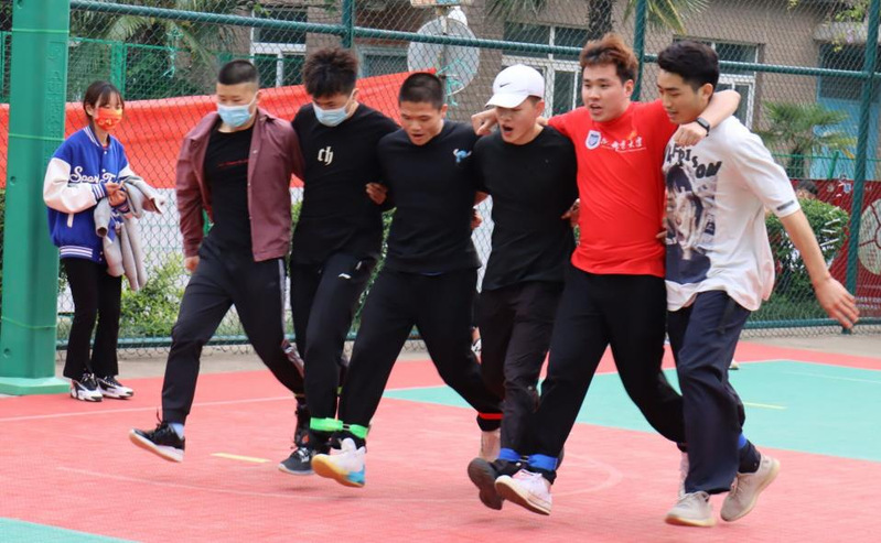 青协员工干部张骏同学宣布规则,并检查安全事项后开始。第一场是“六人五足”团体比赛,按照班级抽签顺序进行比赛;第二场是“两人三足”个人比赛。此项活动考验班级同学间的默契度以及凝聚力。随着裁判员、计时员和记录员的就位,主持人一声令下,比赛开始!各组成员冲出跑线,小组有的一气呵成、有的磕磕绊绊、有的缓慢且平稳。团体赛前三名为:信工一班、信工三班、财管三班。两人赛女生组获奖选手为戚丹静和侯姝妍、张灿灿和孙玲慧,男生组获奖选手为陈启明和马凯旋、赵道坤和李凯施、黄万夫和吴燚飞。