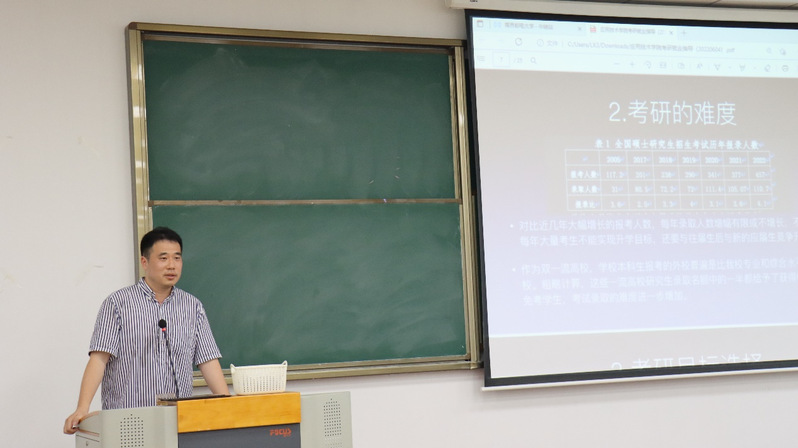 针对考研,张书记主要从四个方面给同学们展开指导。一是从同学们普遍关注的问题出发,指导同学们科学评估自身情况,理性分析考试难度,平衡好考研和就业的目标选择。二是针对接下来暑假的学习安排,详细指导了考研公共课和专业课的复习规划,提出了分阶段重点要完成的复习与学习任务。三是对考研复习的具体方法和学习平台选择进行相关介绍和指导。四是详细布置了近期同学们需要完成的任务和学院接下来持续到今年年底的支持工作计划。张书记鼓励同学们既要有慎重的考虑,也要有加油干的志气,期待一起努力获得2023年研究生入学考试的更好成绩!