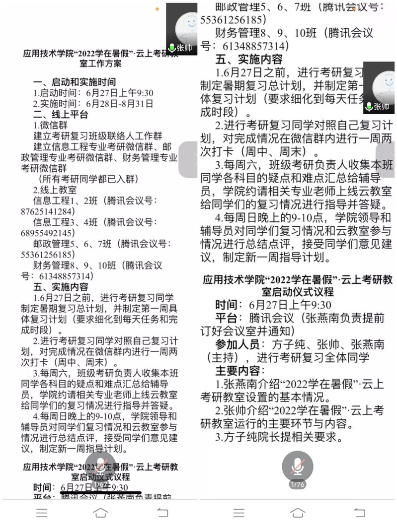 会议上,张书记对云上考研教室的基本情况对同学们做出介绍。云上考研教室主要是为了督促同学们暑期在家能够提高学习效率,通过一周两次的打卡,对同学们的日常学习任务的完成情况,做一个监督和提醒。同时张书记表示,对于同学们学习过程中遇到的困难,老师们也会竭尽所能地提供帮助和指导。云上考研教室以周为单位,在每周末对同学们的学习情况进行总结点评,并制定下一周学习计划。
