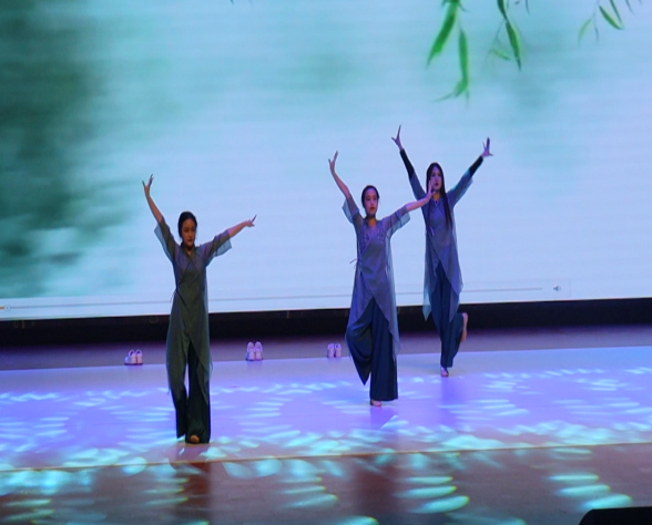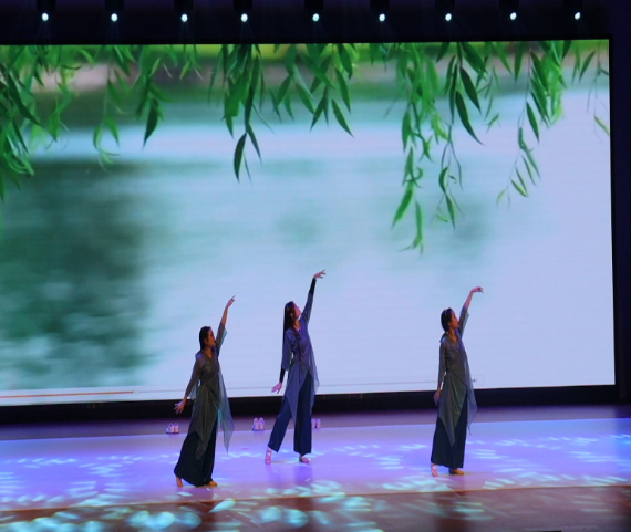 舞台上,三位同学轻歌曼舞,一曲惊鸿,长袖蹁跹,道不尽百转风情。舞态生风,丰姿冶丽,胜得过千般模样。她们如同轻盈地踏着晨光,尽情地挥洒洋溢的青春。