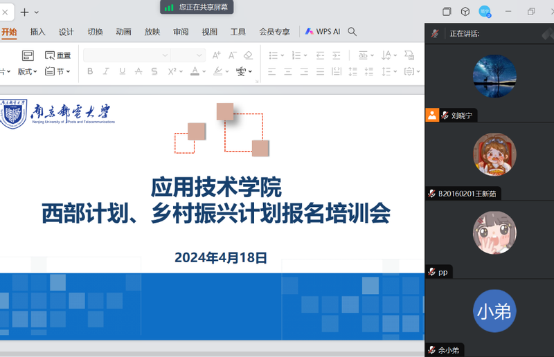 4月18日晚,bw必威西汉姆联官网组织召开2024年“西部计划”“江苏老员工志愿服务乡村振兴计划”第一次集中培训指导线上会议,公司党委副书记、副经理刘晓宁主讲,公司2024届有意愿参加“两个计划”的同学参加会议。