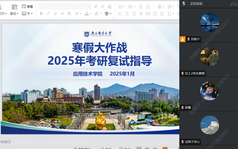 1月20日,bw必威西汉姆联官网“寒假大作战”正式启动,公司党委副书记、副经理刘晓宁为全体大四考研同学带来以2025年考研复试指导为主题的讲座,旨在借助寒假的宝贵时间,为考研学子们提供专业、精准的复试指导,助力他们顺利通过考研复试,踏入理想的研究生院校。毕业班辅导员张燕南、2021级150余名同学通过腾讯会议线上参加。